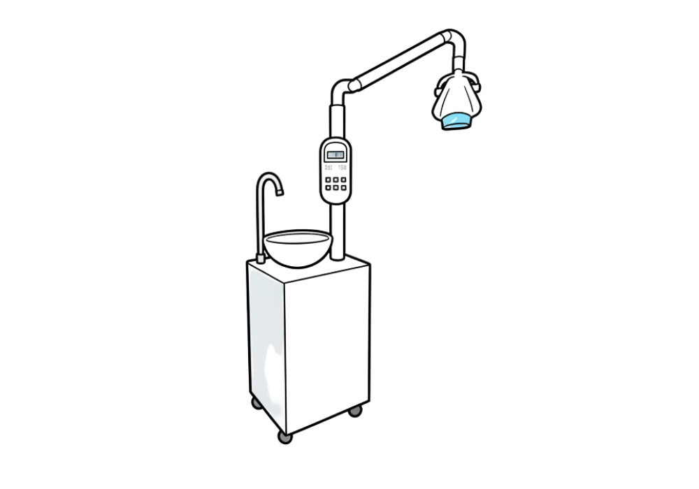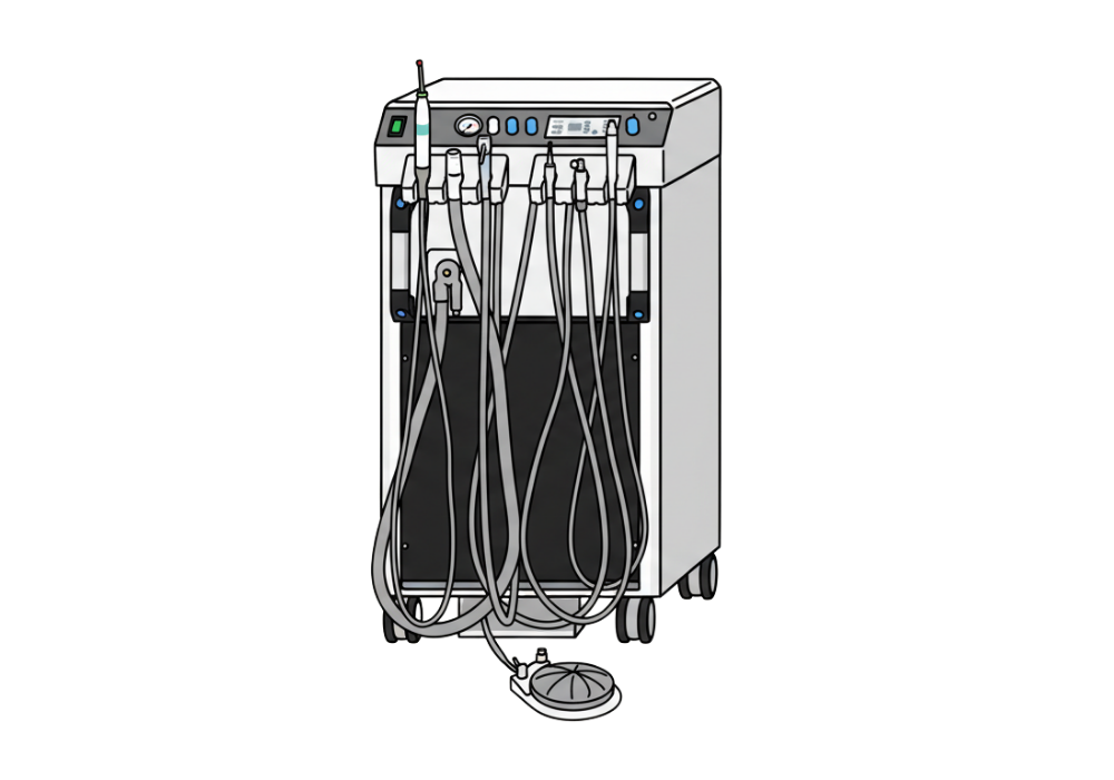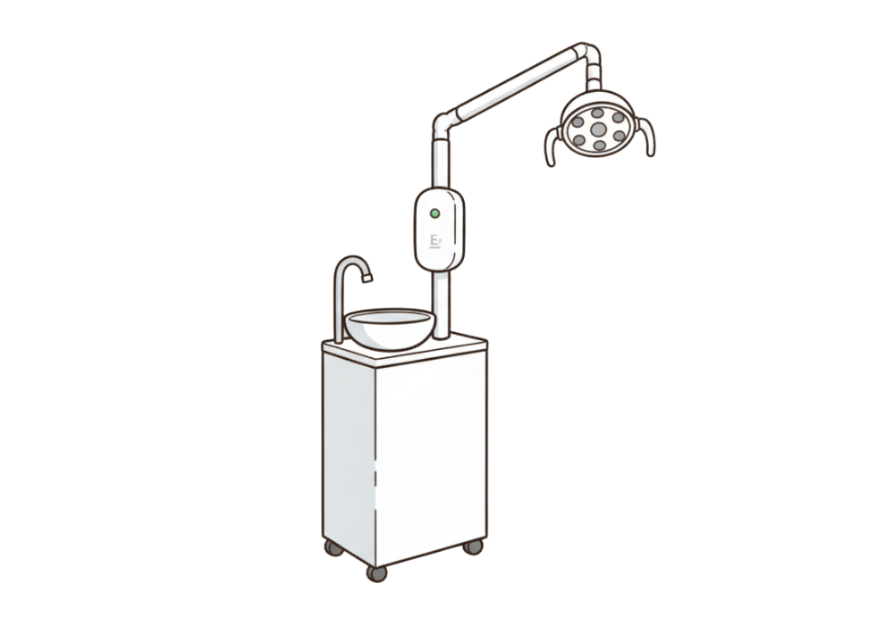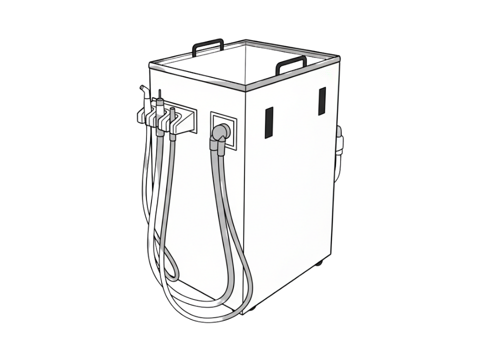 一般的な歯科用ユニットを【チェア部】【ドクターテーブル部】【アシスタントテーブル部】【スピットン部】【無影灯部】に分け、それぞれが単独で使用ができる機器になっております。各機器に必要な・給排水設備・コンプレッサー・サクションは搭載されており、全ての機器は 100v のコンセントに繋ぐだけで使用可能となっております。